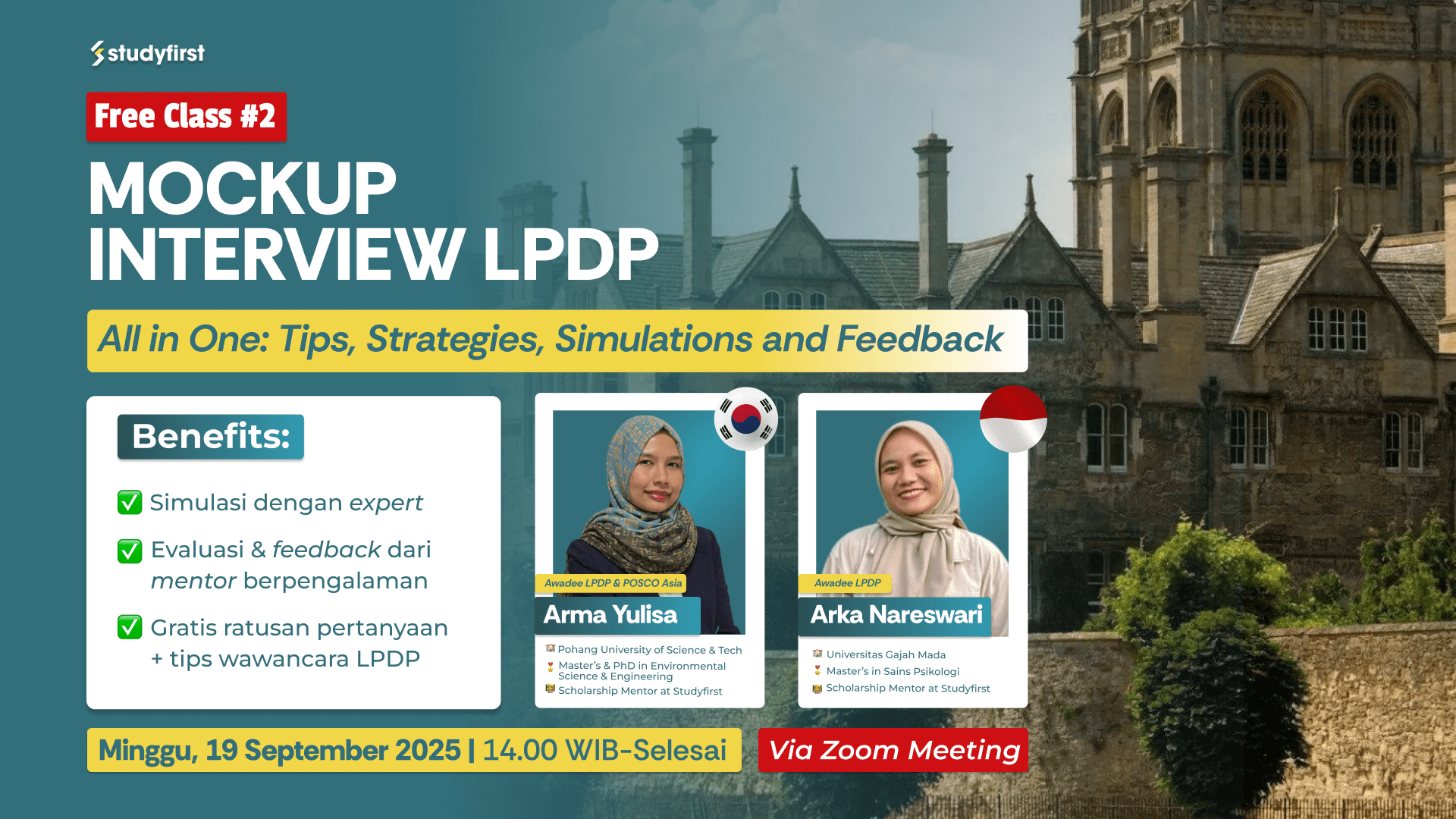 Pada kesempatan kali ini, Studyfirst menghadirkan dua narasumber inspiratif yang sudah membuktikan pencapaiannya lewat berbagai prestasi akademik maupun pengalaman internasional. Arma Yulisa, awardee LPDP sekaligus penerima beasiswa POSCO Asia yang saat ini tengah menempuh studi doktoral di Pohang University of Science and Technology (POSTECH), Korea Selatan. Sementara itu, Arka Nareswari merupakan awardee LPDP lulusan Magister Psikologi Universitas Gadjah Mada yang dikenal aktif dalam pengembangan potensi mahasiswa dan pelatihan wawancara beasiswa.