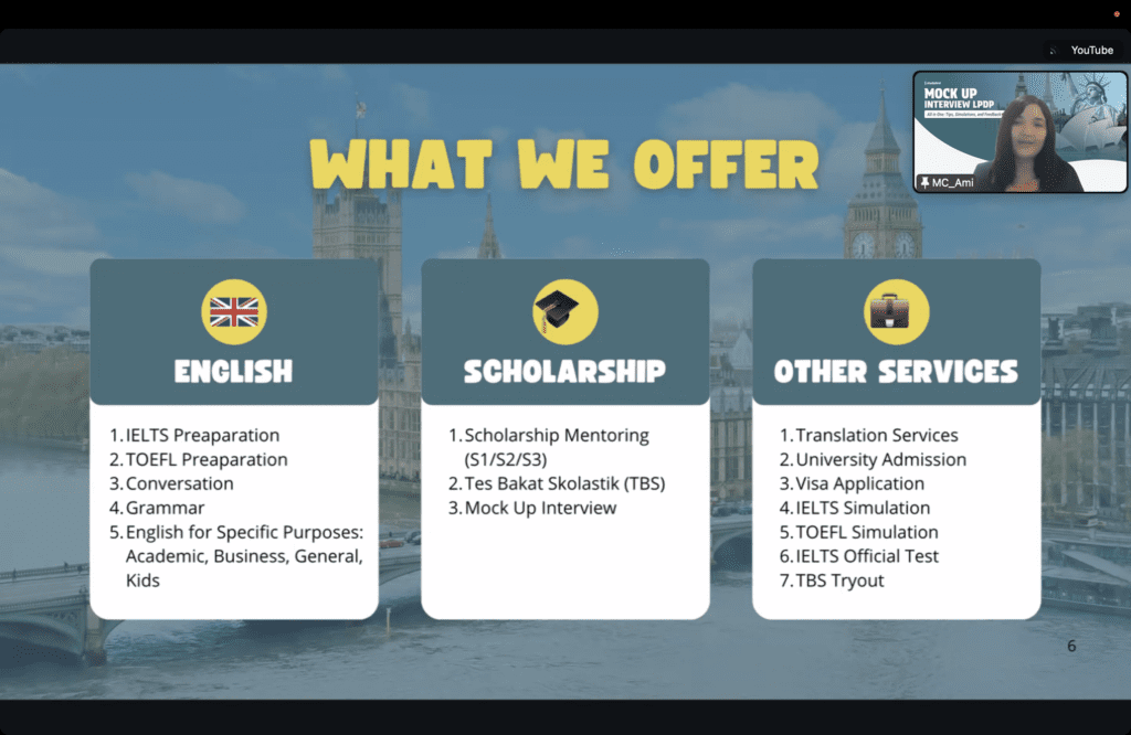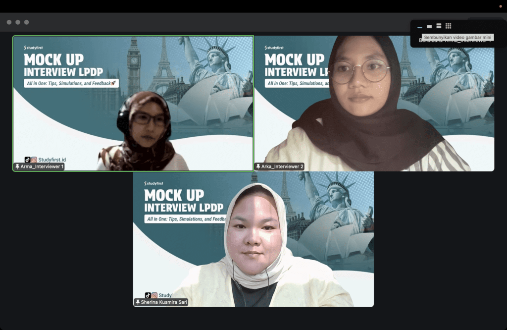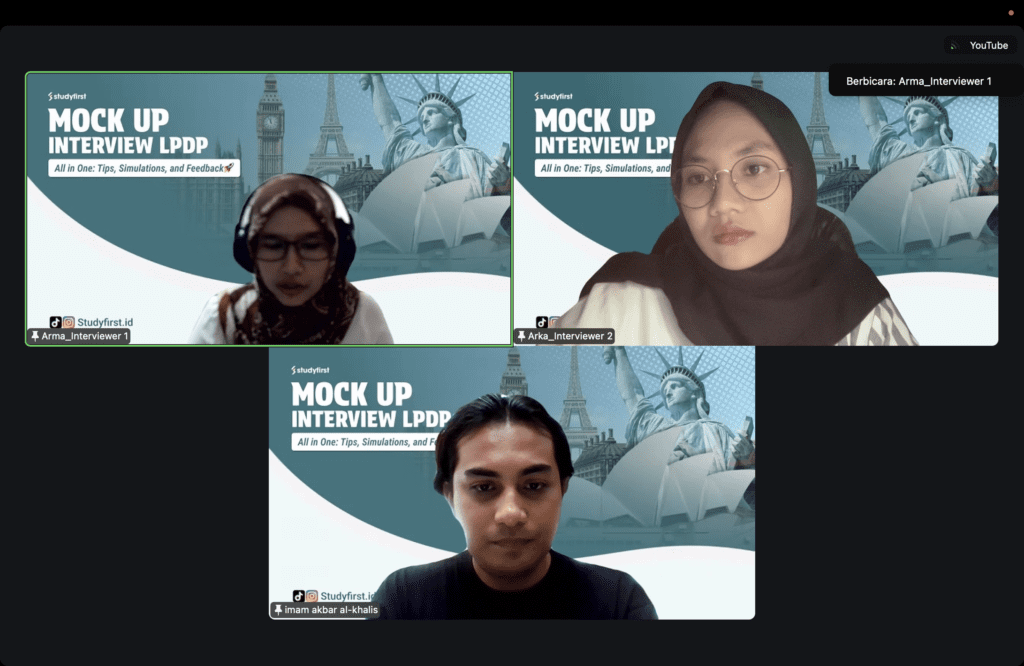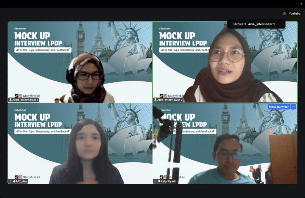 Pada Minggu, 19 Oktober 2025, Studyfirst kembali menggelar kelas gratis Mock Up Interview LPDP part 2 yang diselenggarakan secara daring melalui platform Zoom Meeting pukul 14.00 WIB. Acara ini diikuti oleh 59 peserta, dengan 49 peserta bergabung via Zoom dan 5 lainnya melalui YouTube live streaming.