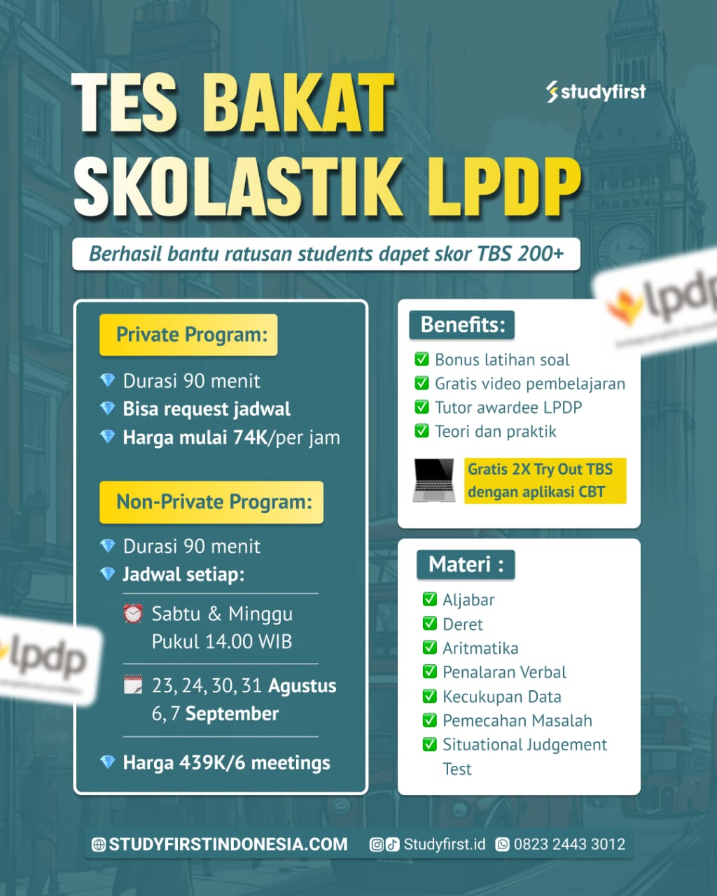 Tes Bakat Skolastik (TBS) dirancang untuk mengukur kemampuan kuantitatif, verbal, dan pemecahan masalah yang jadi kriteria kelulusan beasiswa. Studyfirst siap bantu kamu dapatkan skor impian dengan cara mengubah teori kompleks menjadi tips praktis yang sederhana!
